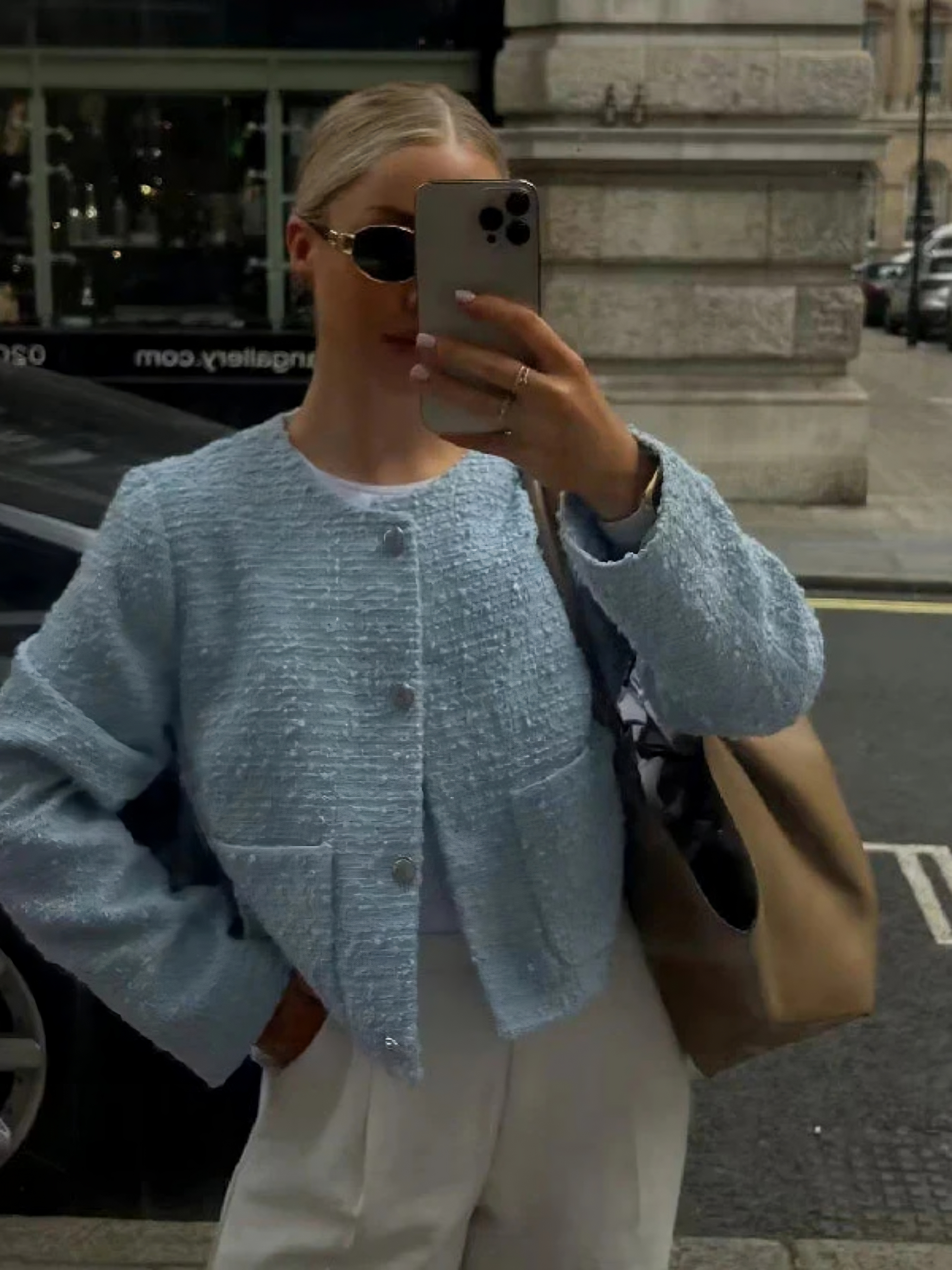 Damska sukienka z tweedu – mini z długim rękawem I kwadratowym dekoltem