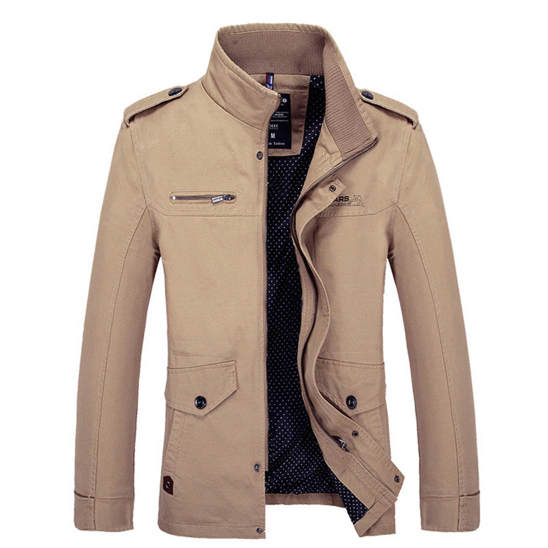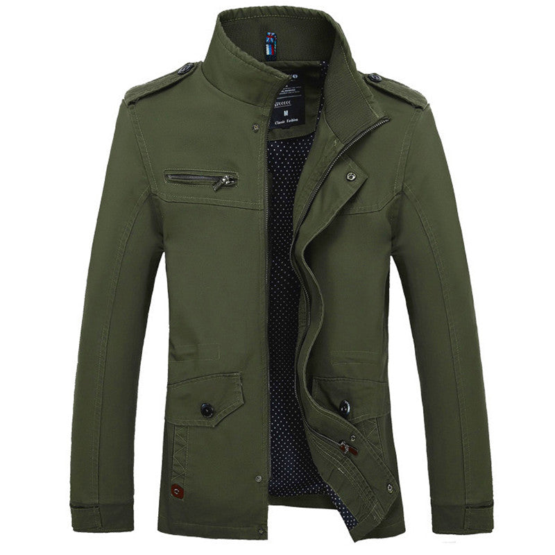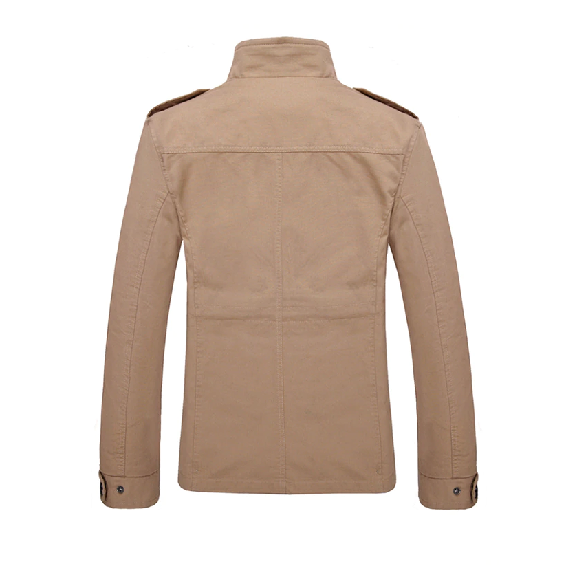 Zimowy płaszcz męski ze stójką, zapinany na suwak i zatrzaski. Wyposażony w regulację w pasie oraz kieszenie. Wewnętrzna podszewka z wzorem.