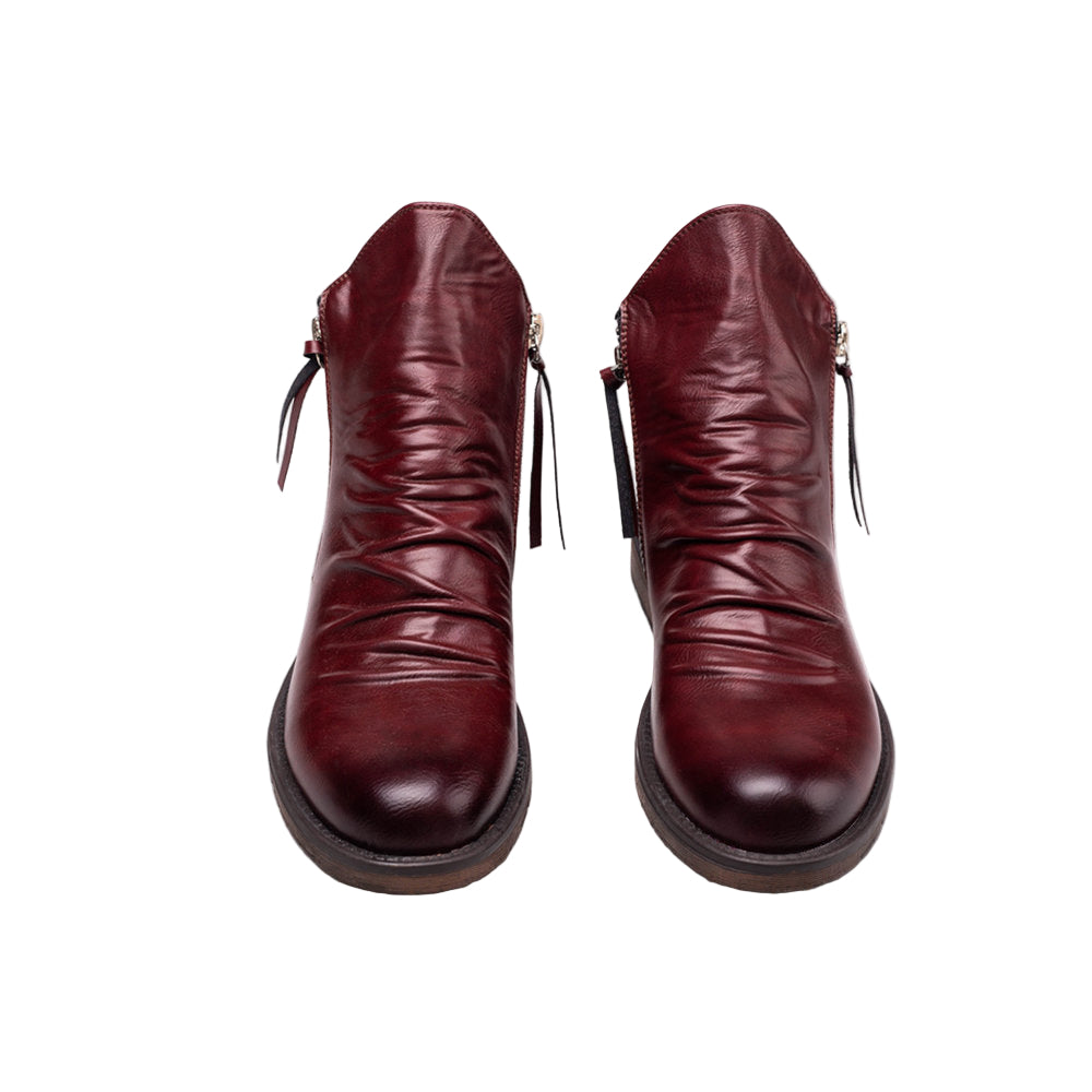 Męskie botki z okrągłym noskiem i niskim obcasem w kształcie podkowy. Posiadają cholewkę o średniej wysokości, metalowe detale oraz dwukierunkowy zamek błyskawiczny po bokach.