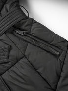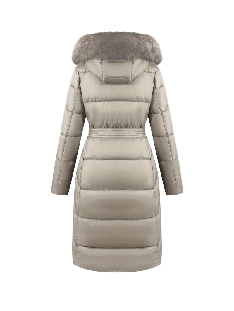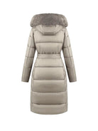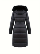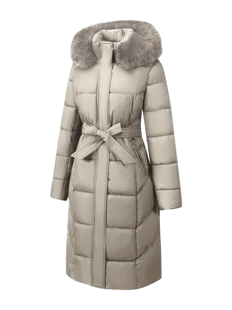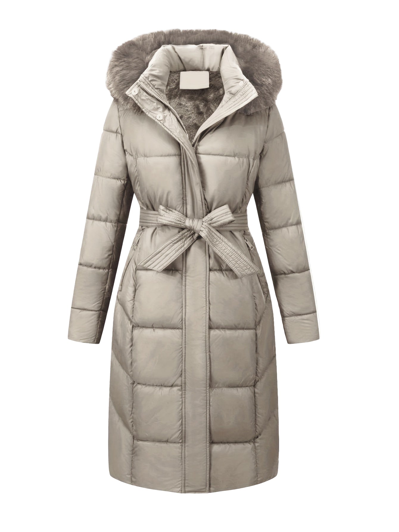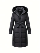 Damski zimowy płaszcz midi z kapturem i paskiem w talii