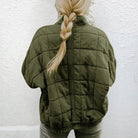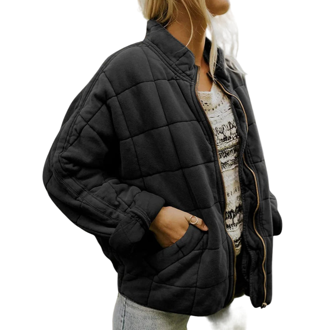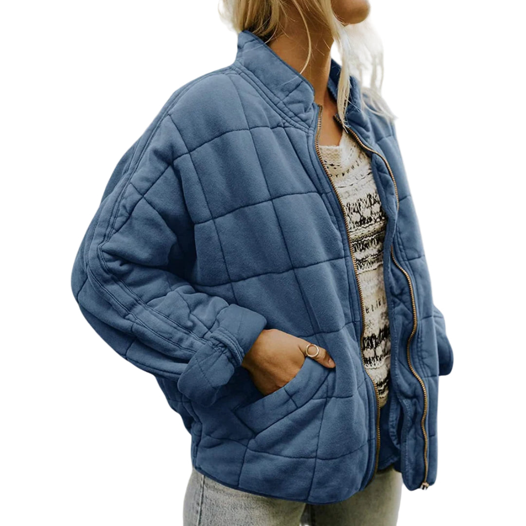 Damska kurtka pikowana przejściowa o prostym kroju i pikowanej strukturze. Posiada boczne kieszenie i długie rękawy. Przeszycia uzupełniają całość.
