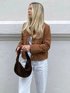 Damska kurtka wykonana z zamszu o klasycznym kroju. Posiada prostą linię ramion i dopasowany krój tułowia. Wyposażona w stojący kołnierzyk oraz zapięcie na guziki, a także dwie boczne kieszenie i subtelne przeszycia podkreślające konstrukcję.
