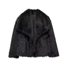 Damska kurtka ze sztucznego futra o prostym kroju z długimi rękawami i klasycznym kołnierzem. Z przodu znajduje się zapięcie na guziki, a całość wykończona jest równymi szwami.
