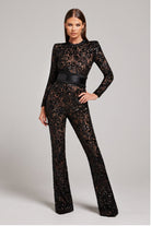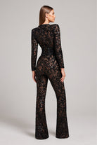 Zachwycaj elegancją w tym kombinezonie z koronki ozdobionej błyszczącymi cekinami. Model posiada długie rękawy z przezroczystymi wstawkami, dopasowaną talię i rozszerzane nogawki, które podkreślają kobiecą sylwetkę. Idealny wybór na wyjątkowe okazje, przyjęcia i uroczystości.