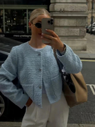 Ta elegancka marynarka bouclé to połączenie ponadczasowego stylu i wyrafinowania. Idealna do biura i na oficjalne spotkania lub nawet w nieformalnych stylizacjach.
