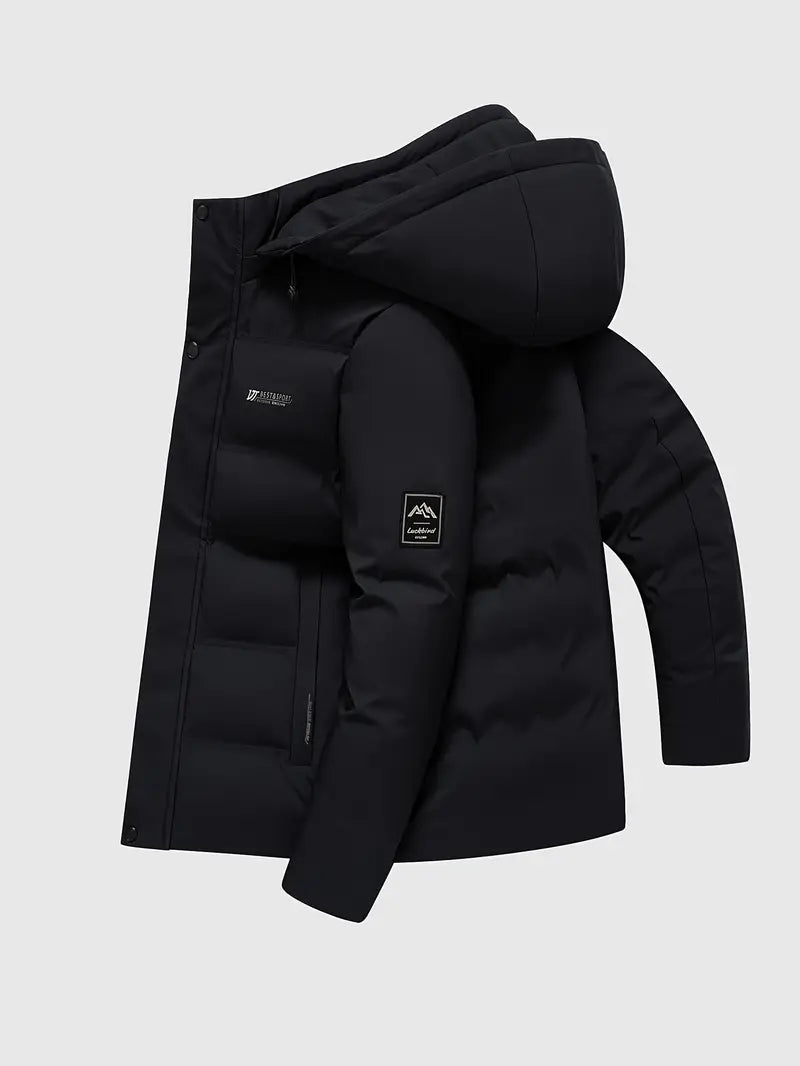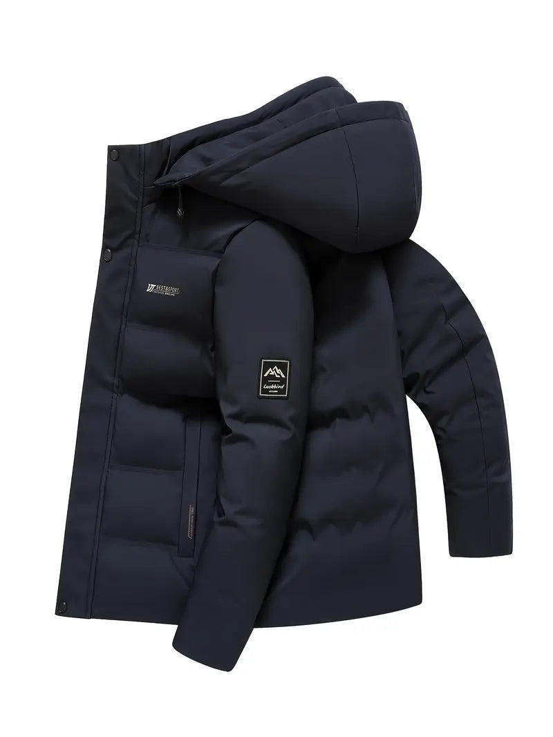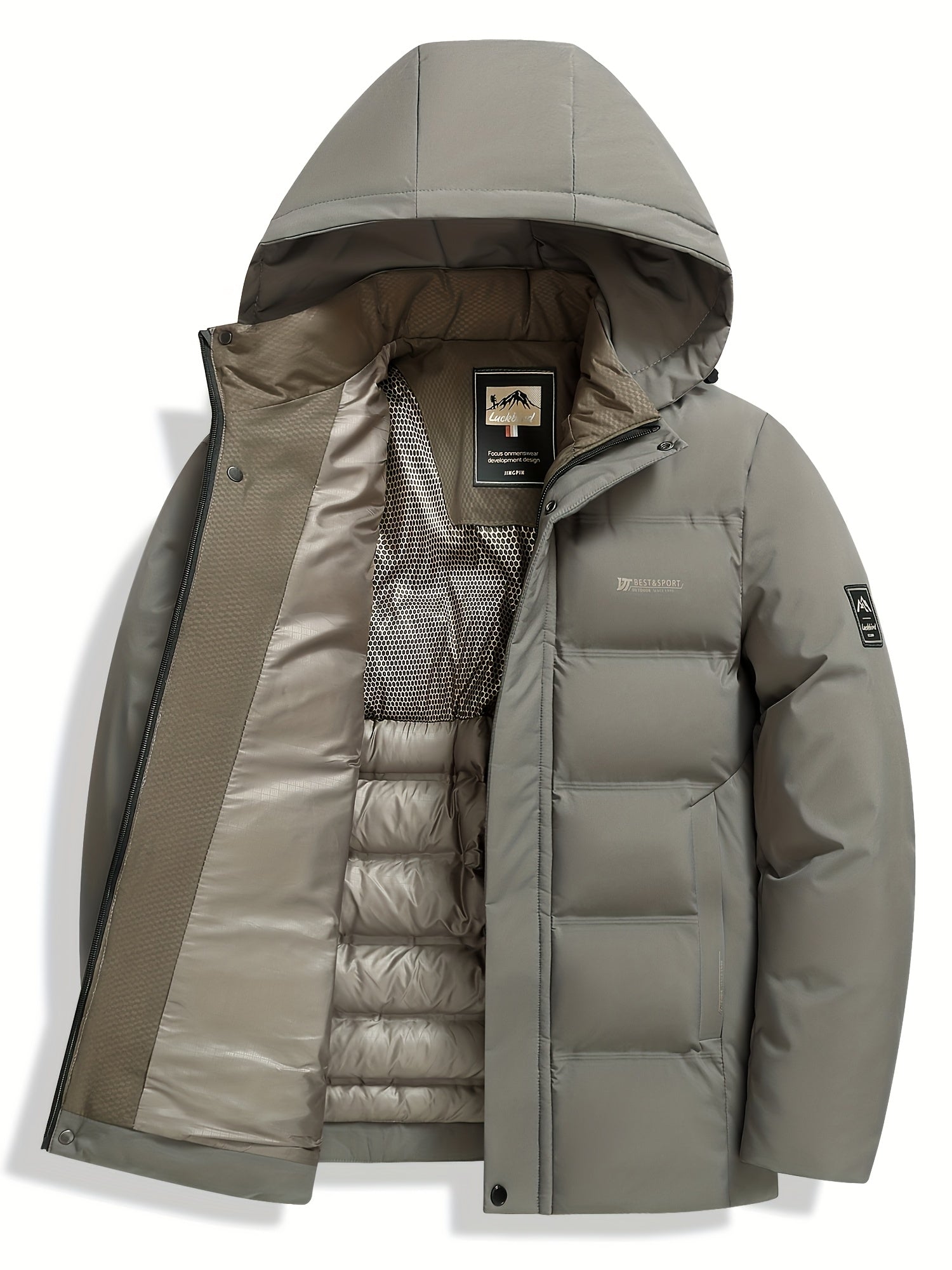 Męska kurtka zimowa z klasycznym krojem i stójką. Kurtka posiada zamek błyskawiczny, długie rękawy oraz kieszenie zapinane na zamek. Luźny fason zapewnia swobodę ruchów, a odpinany kaptur umożliwia różne warianty noszenia.