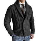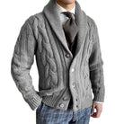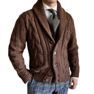 Męska zimowa kurtka dzianinowa wykonana z grubego splotu o wyraźnej strukturze. Model posiada prosty krój oraz detale charakterystyczne dla odzieży zimowej.