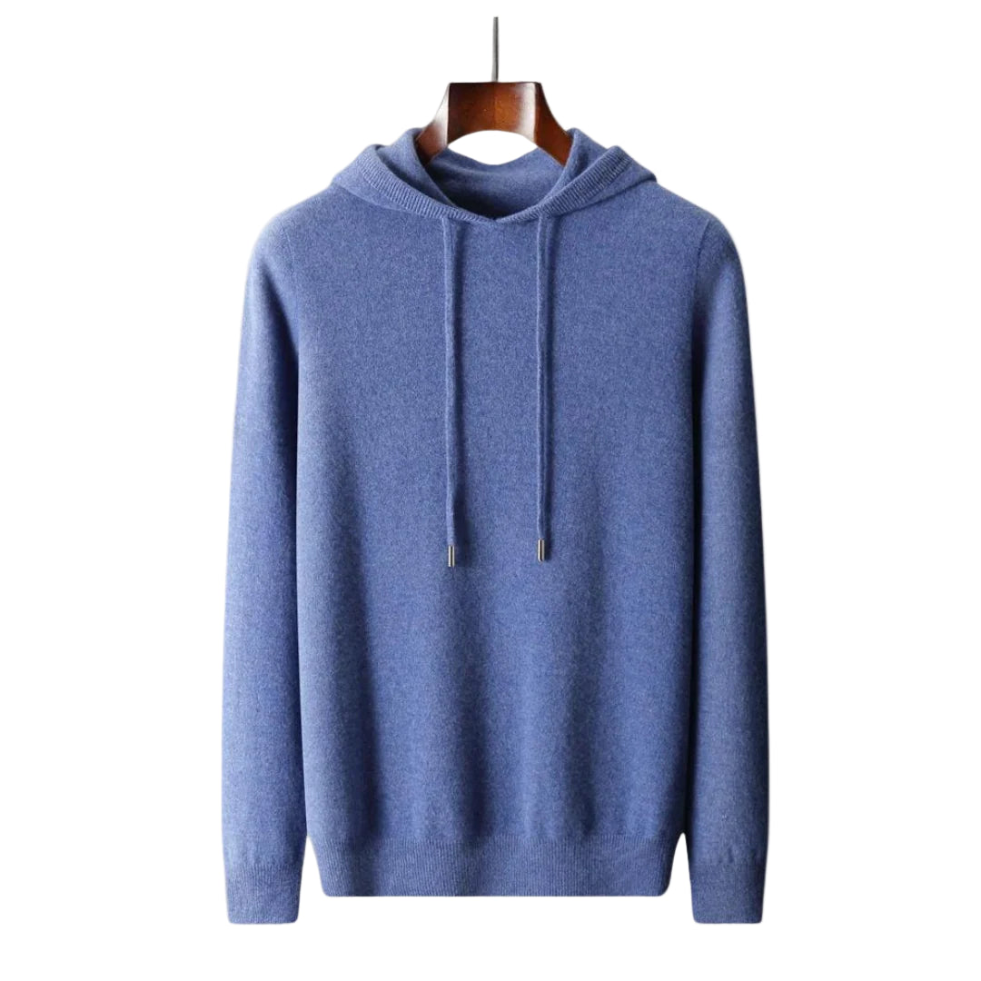 Ten męski zimowy sweter z kapturem wykonany jest z wełny merynosów. Ma klasyczny styl z długimi rękawami i kapturem. Szwy są proste, a przód gładki. Materiał ma jednolitą strukturę z widocznym splotem.